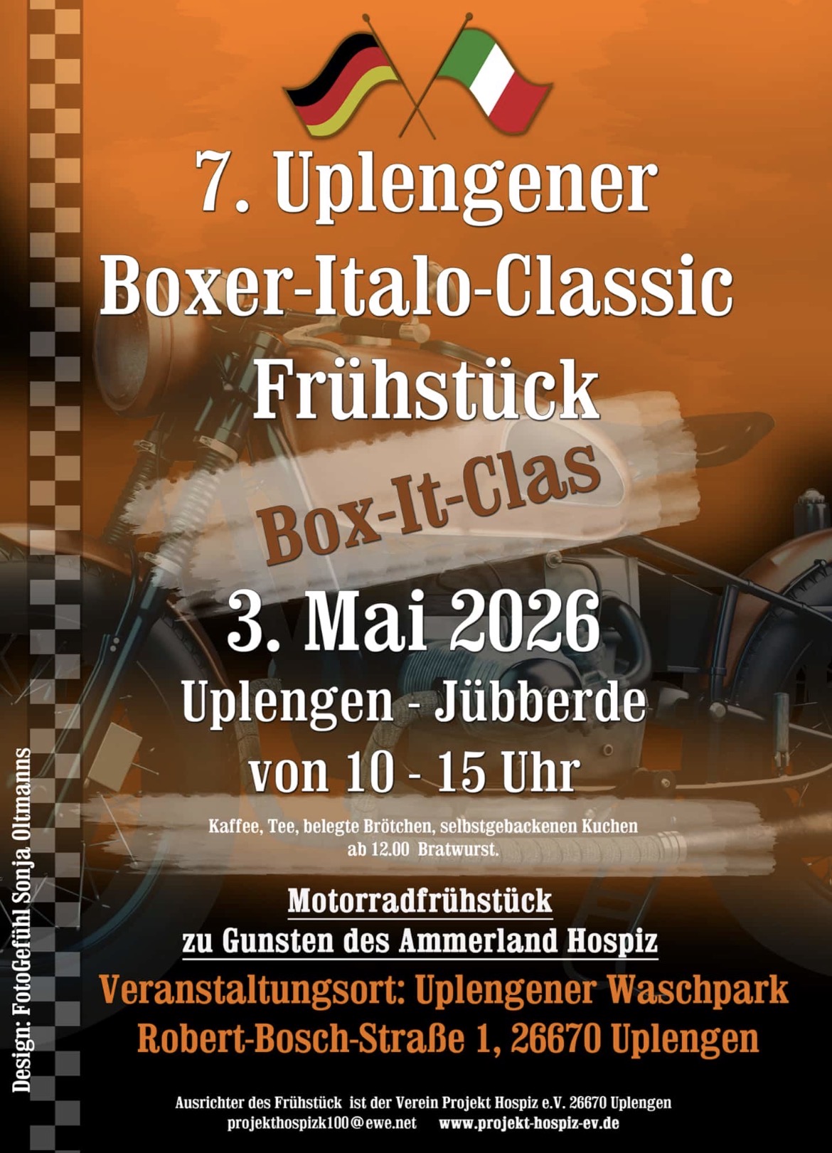 Am 3. Mai findet wieder das legendäre Box-It-Clas-Frühstück im Waschpark in Uplengen statt. Ab 9 Uhr gibt es bei uns belegte Brötchen, warme Getränke und Kuchen. Ab 12 Uhr gibt es zusätzlich Bratwurst.